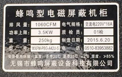 屏蔽机柜接地要求 1、屏蔽机柜使用前必须经机柜接地端子进行保护接地电缆连接。 2、机柜内电子设备按使用要求进行接地。 屏蔽机柜供电 1、供电电源滤波器 规格为220V / 16A(三线) 2、PDU电源分配器 PDU规格为6位220V/ 16A 3、供电空气开关 空气开关规格:(220V / 63A) 屏蔽机柜产品铭牌图示